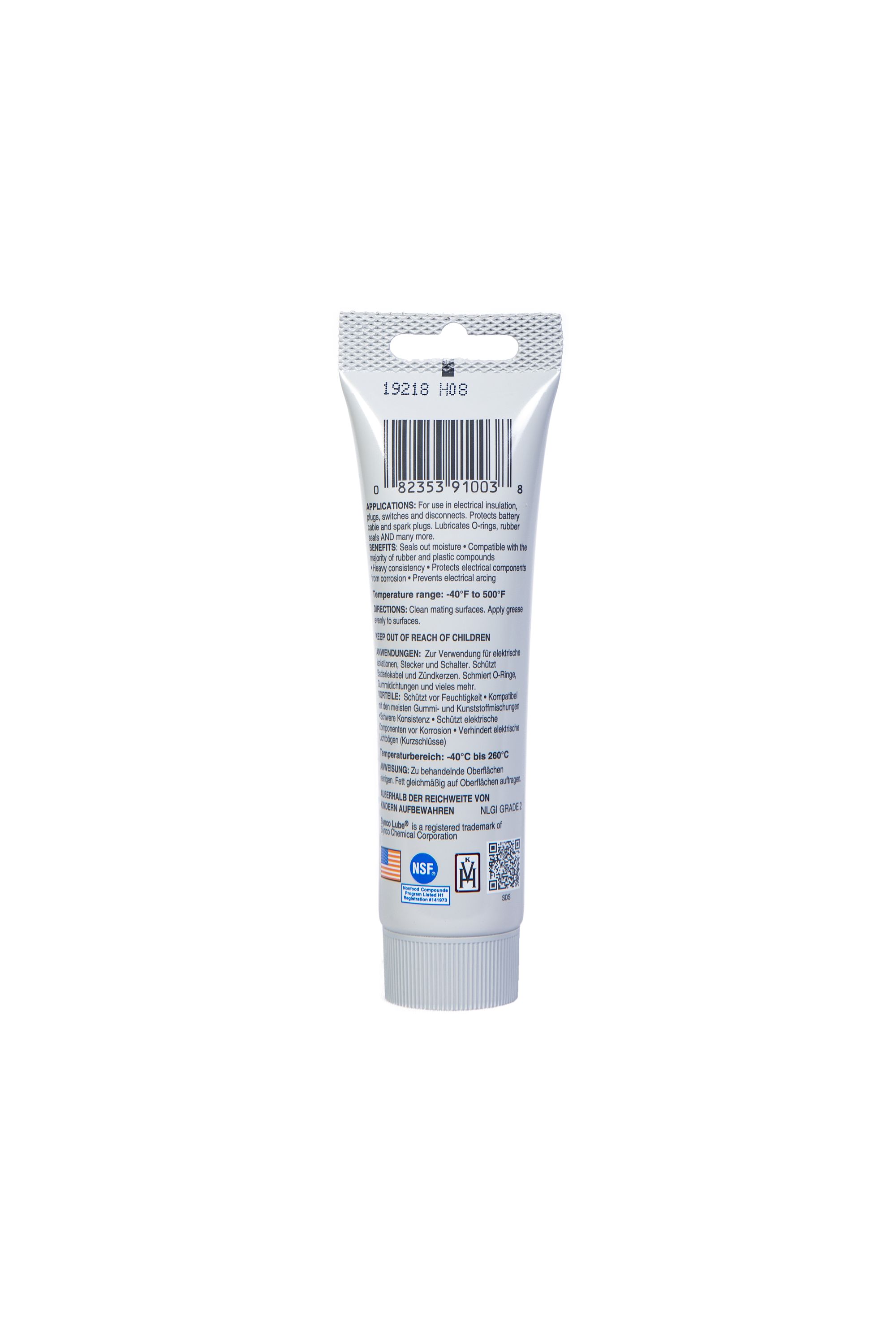 SYNCO LUBE® SILIKON DIELEKTRIKUM FETT ist ein NSF registrierter, lebensmitteltauglicher Schmierstoff mit der Einstufung H1 für zufälligen Kontakt mit Lebensmitteln. Darüber hinaus ist es umweltfreundlich.