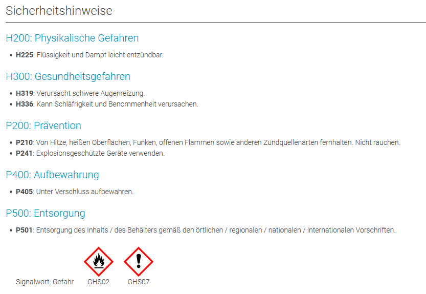 - H225: Flüssigkeit und Dampf leicht entzündbar.