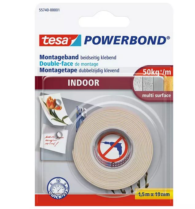 Das doppelseitige Montageklebeband tesa Powerbond INDOOR klebt extra stark und ist die clevere Alternative zu Schrauben und Nägeln. Durch seine hohe Klebeleistung eignet es sich für alles, was im Innenbereich ohne Hilfe eines Bohrers oder Hammers aufgehängt werden soll / muss, z.B. Bilder, Schlüsselkästen oder Pinnwände. Praktischerweise gleicht das Montageklebeband leichte Unebenheiten einfach aus. Es lässt sich individuell zuschneiden und ist somit die ideale Wahl für Handwerker-Projekte und das Anbringen von Dekorationsartikeln. Powerbond® - Besser Kleben statt Bohren!