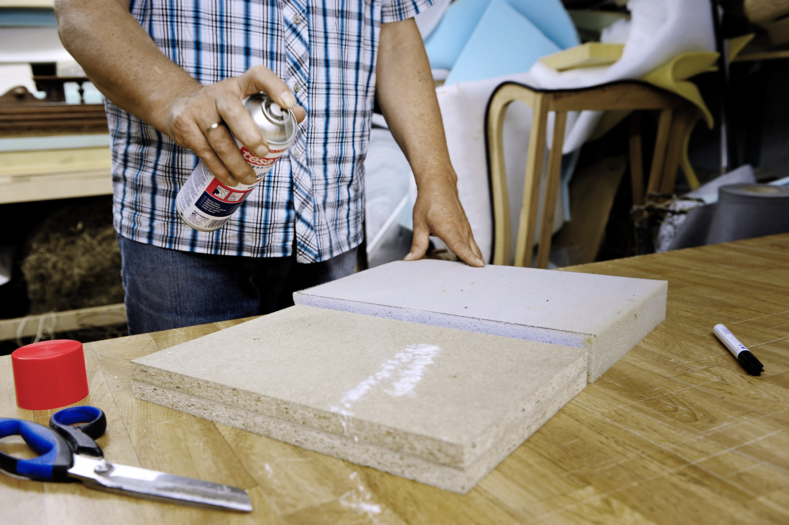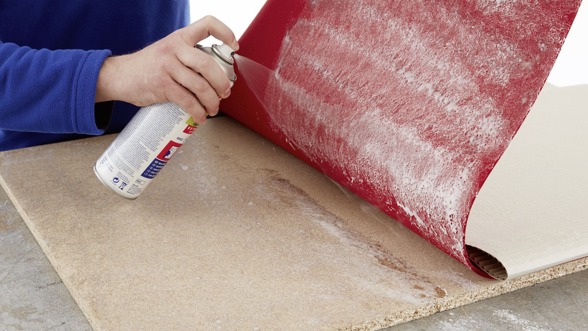 Der Kleber wird direkt aus der Sprühdose gleichmäßig auf die Oberfläche aufgetragen.